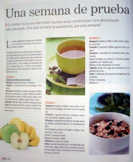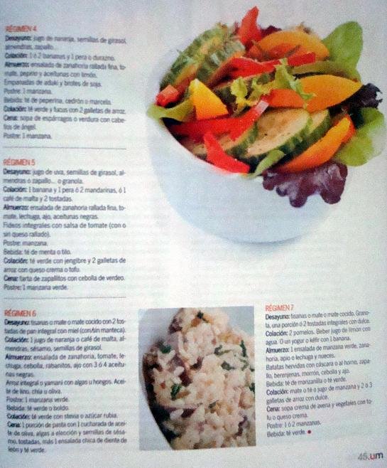 Almuerzo: Ensalada de zanahoria, tomate, lechuga, cebolla, rabanitos, ajo con 3 o 4 aceitunas negras. Arroz integral o yamani con algas u hongos. Aceite de Lino, Chia u Oliva. Postre: 1 manzana verde. Bebida: te verde o boldo. Colación: Té verde con Stevia o azúcar rubia.